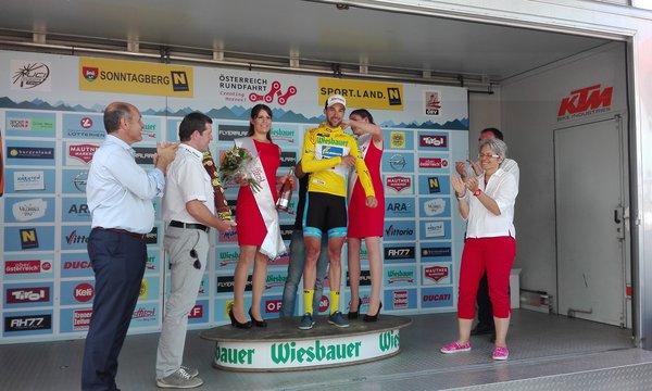 Schon beim Start in Ardagger kamen die Fahrer ins schwitzen, denn um 11 Uhr brannte die Sonne bereits mit heißen 26 Grad auf den Asphalt. Brennheiß war auch die Motivation, denn heute ging es hoch hinaus Richtung Sonntagberg, der für seine Zuschauermassen der vergangenen Jahre bekannt ist. Gleich zu Beginn wartete ein steiler Anstieg auf das Peloton, bei dem so manche schon die Strapazen der letzten Tage spürten. Diese Chance nutzten Marcin Mrozek (CCC Sprandi Polkowice), Alessandro Vanotti (Astana), Anthony Perez (Cofidis) und Alexej Rybalkin (Gazprom-RusVelo) und setzten sich nach 10 gefahrenen Kilometern ab. Kurze Zeit später schaffte auch Frederik Backaert (Wanty-Group Bobert) den Anschluss und die Spitzengruppe war komplett. Für uns hatte diese Gruppe noch keine große Bedeutung also entschied sich Andreas Grossek, noch abzuwarten und erst nach der zweiten Bergwertung bei Kilometer 72,7 Andreas Walzel an die Spitze des Hauptfeldes zu schicken um das Tempo zu erhöhen. Daniel Auer hatte inzwischen im hinteren Teil des Feldes mit Magenproblemen zu kämpfen und versuchte mit aller Kraft, den Anschluss nicht endgültig zu verlieren. Rund 35 Kilometer vor dem Ziel trug die Nachführarbeit von unseren Fahrern, dem Team Roth und Team Roompot endlich Früchte und der Vorsprung der Spitzengruppe verkleinerte sich stetig. Bei der 10 Kilometer-Marke vor dem Ziel war es schlussendlich um die Ausreißer geschehen und das Feld fuhr geschlossen in den 3,5 Kilometer langen Schlussanstieg. Die Anspannung im Betreuerauto war enorm, denn die fast 70 Kilometer Nachführarbeit sollten sich nun endlich so richtig bezahlt machen. Das Feld zerriss immer mehr, da ein Großteil der Fahrer das hohe Tempo nicht mehr halten konnten. An der Spitze wurden noch einige Attacken gefahren, so auch zum Beispiel von Brendan Canty (Drapac Professional Cycling). Markus Eibegger witterte seine Chance und gab noch ein aller letztes Mal Vollgas – schaffte es aber leider nicht den 11 Sekunden Vorsprung von Canty aufzuholen. Die Rennen endete zwar nicht wie erhofft mit einem Etappensieg, der dem gebürtigen Steirer noch in seinem Palmares fehlt, sondern mit dem zweiten Platz + dem gelben Trikot + dem rosa Trikot. Wir konnten diese Nachricht zuerst gar nicht glauben als wir im Ziel ankamen und uns gesagt wurde, dass Markus nun der neue Gesamtführende der Rundfahrt und zusätzlich noch der beste Österreicher ist. Die Freude über diesen Dreifach-Erfolg war so unglaublich groß, die Massen am Sonntagberg jubelten dem Träger des Gelben-Trikots lautstark zu und sorgten für Gänsehautfeeling als das Lied „I am from Austria“ ertönte. „Ein Etappensieg wäre schon schön gewesen, aber das Gelbe und das Rosa Trikot zu tragen ist natürlich eine große Ehre, vor allem vor so vielen Zusehern die einen derart enthusiastisch anfeuern. Für uns bedeutet das morgen natürlich eine Menge Arbeit, um die Trikots bestmöglich zu verteidigen, aber wir werden unser Bestes geben!“, so der Felbermayr-Routine. Und morgen wird in der Tat ein harter Arbeitstag, denn da wartet die Königsetappe mit 182,2 Kilometern und dem berüchtigten Großglockner auf unsere Fahrer. Markus Eibegger wird mit seinem heißbegehrten Gelben Trikot definitiv nicht zu übersehen sein. Das Rosa Mannertrikot, für den besten Österreicher, trägt stellvertretend Stephan Rabitsch, der in dieser Wertung aktuell auf Rang zwei liegt. Über diesen Wahnsinns-Erfolge freut sich das gesamte Team – denn das ist ein wahrer Grund zu feiern und zuversichtlich die nächsten Etappen zu bestreiten.